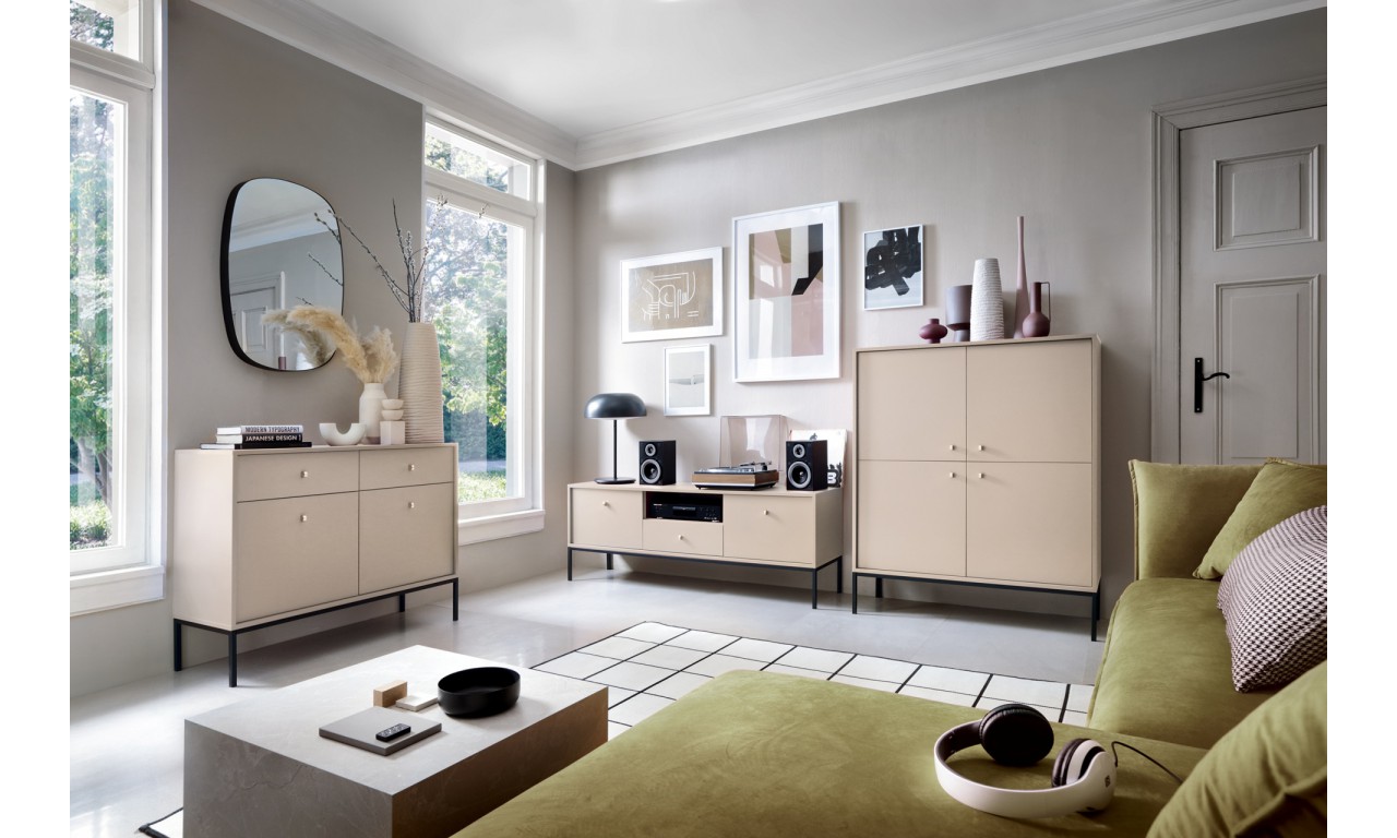 Beżowa komoda w stylu nowoczesnym, należąca do kolekcji mebli Mono.