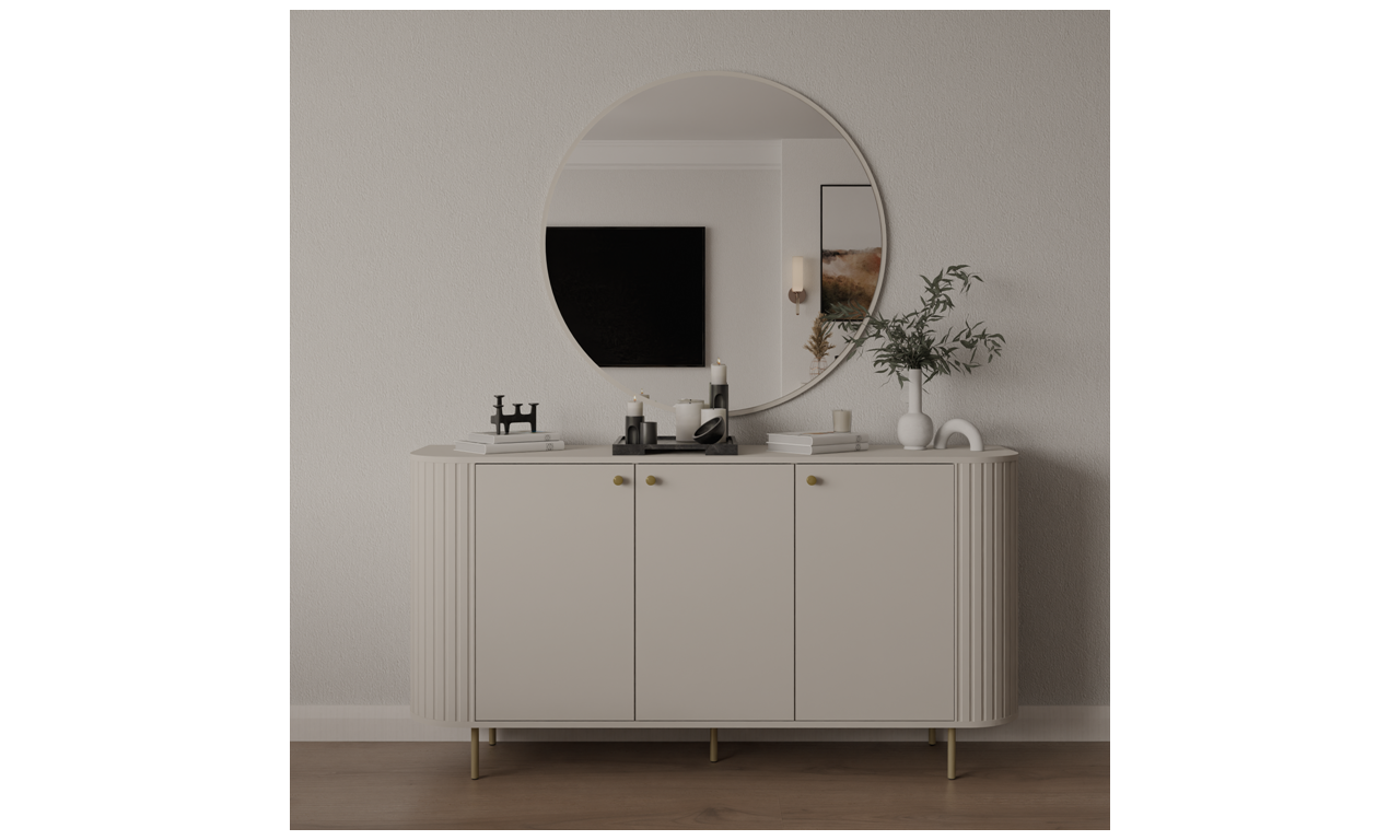Meble do salonu i sypialni Ovalio w kolorystyce piaskowego beżu.
