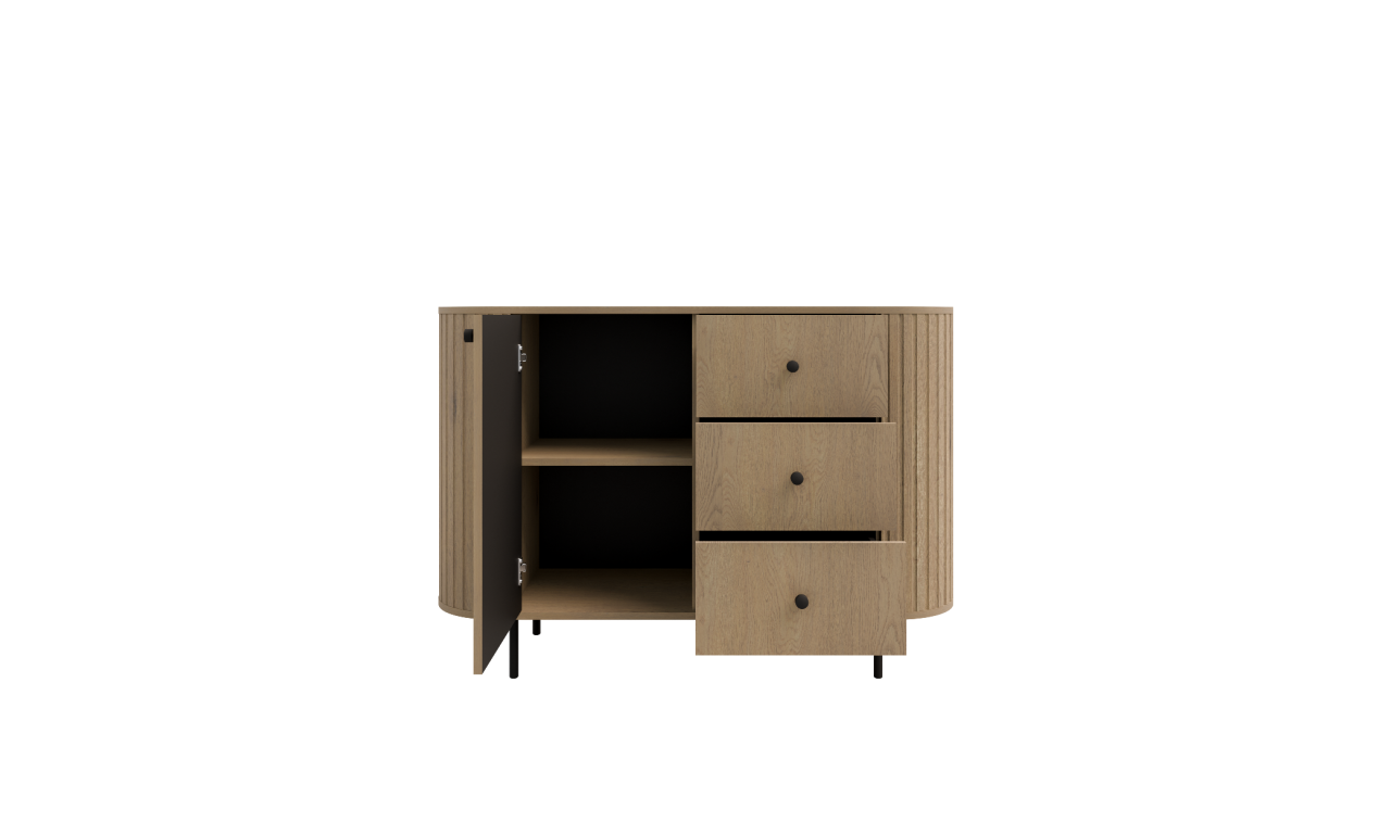 Komoda z kolekcji Iwa w dwóch propozycjach kolorystycznych: białym z frontami w kolorze dąb złoty oraz grafitowym z frontami w kolorze dąb artisan i białym.