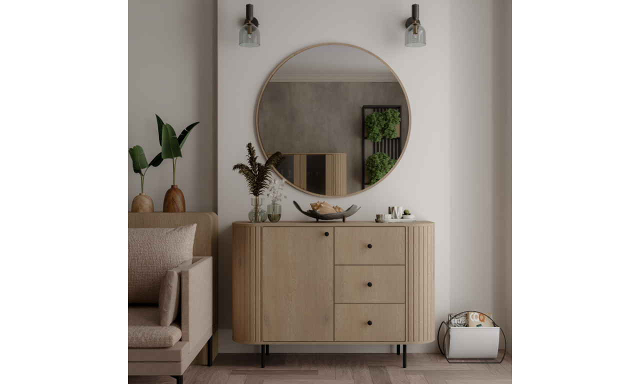 Meble do salonu i sypialni Ovalio w kolorystyce piaskowego beżu.