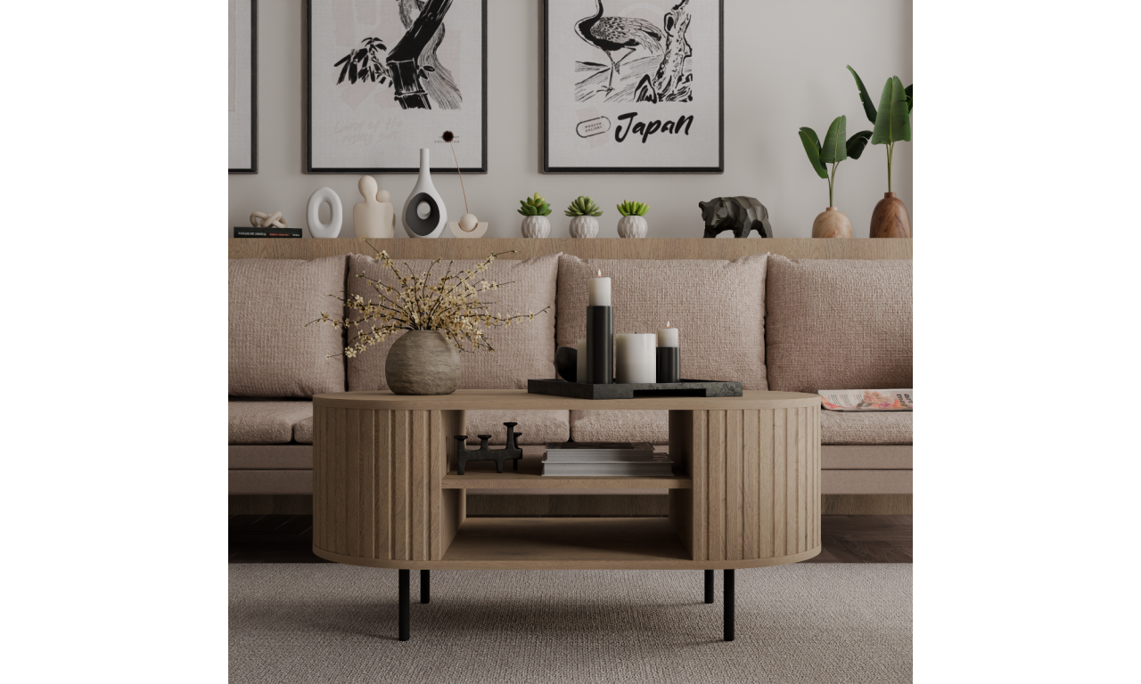 Meble do salonu i sypialni Ovalio w kolorystyce piaskowego beżu.