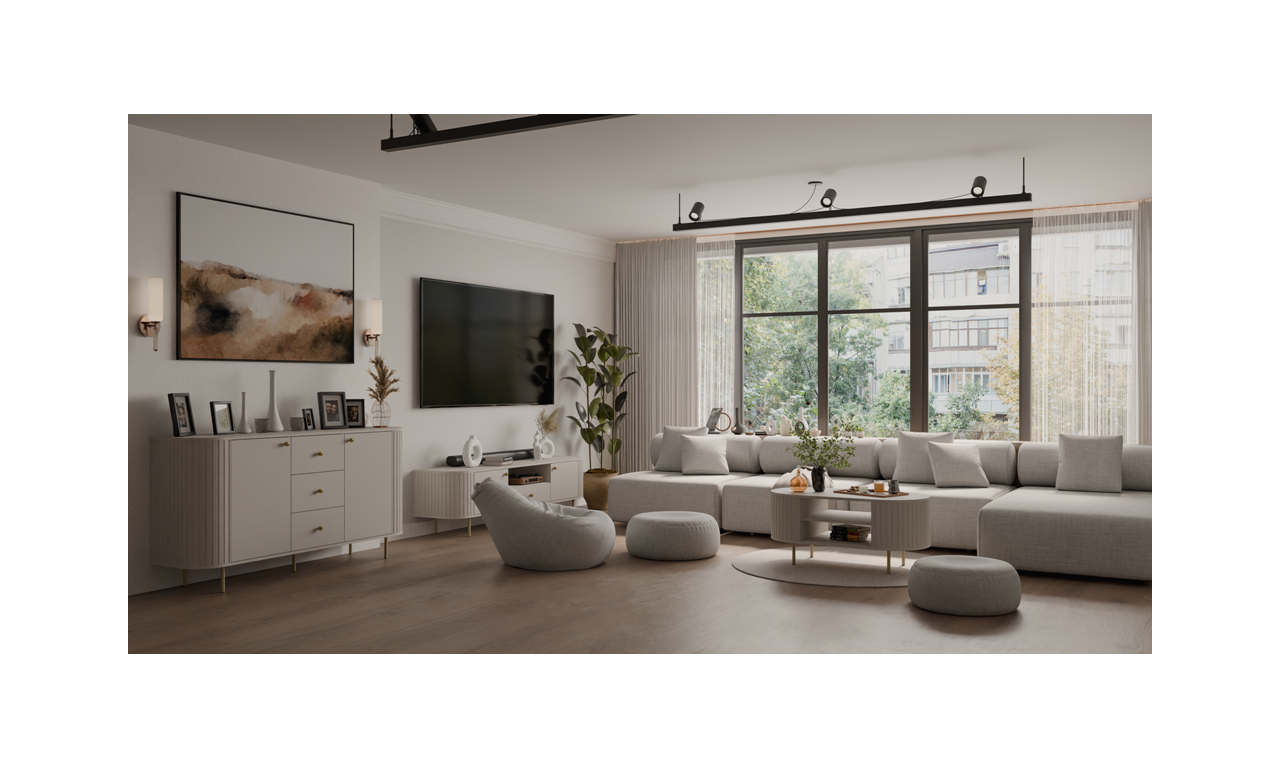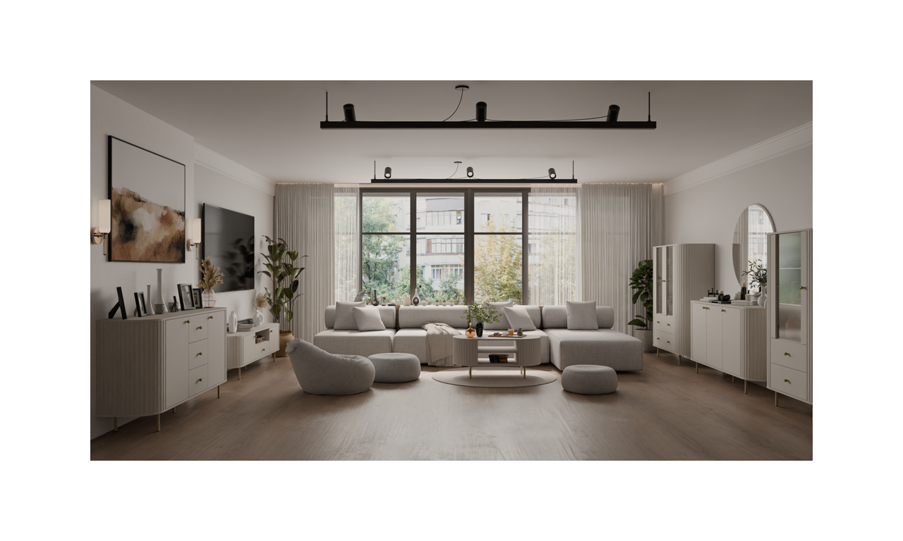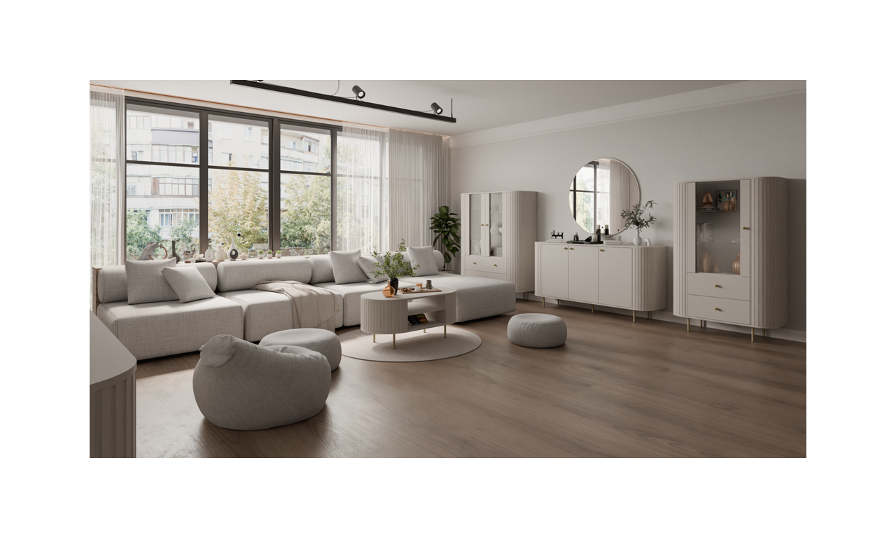 Meble do salonu i sypialni Ovalio w kolorystyce piaskowego beżu.