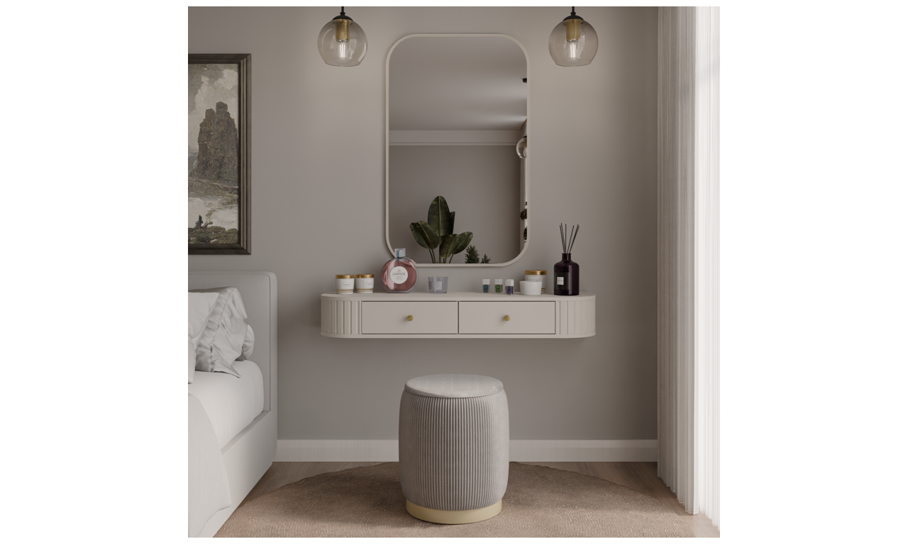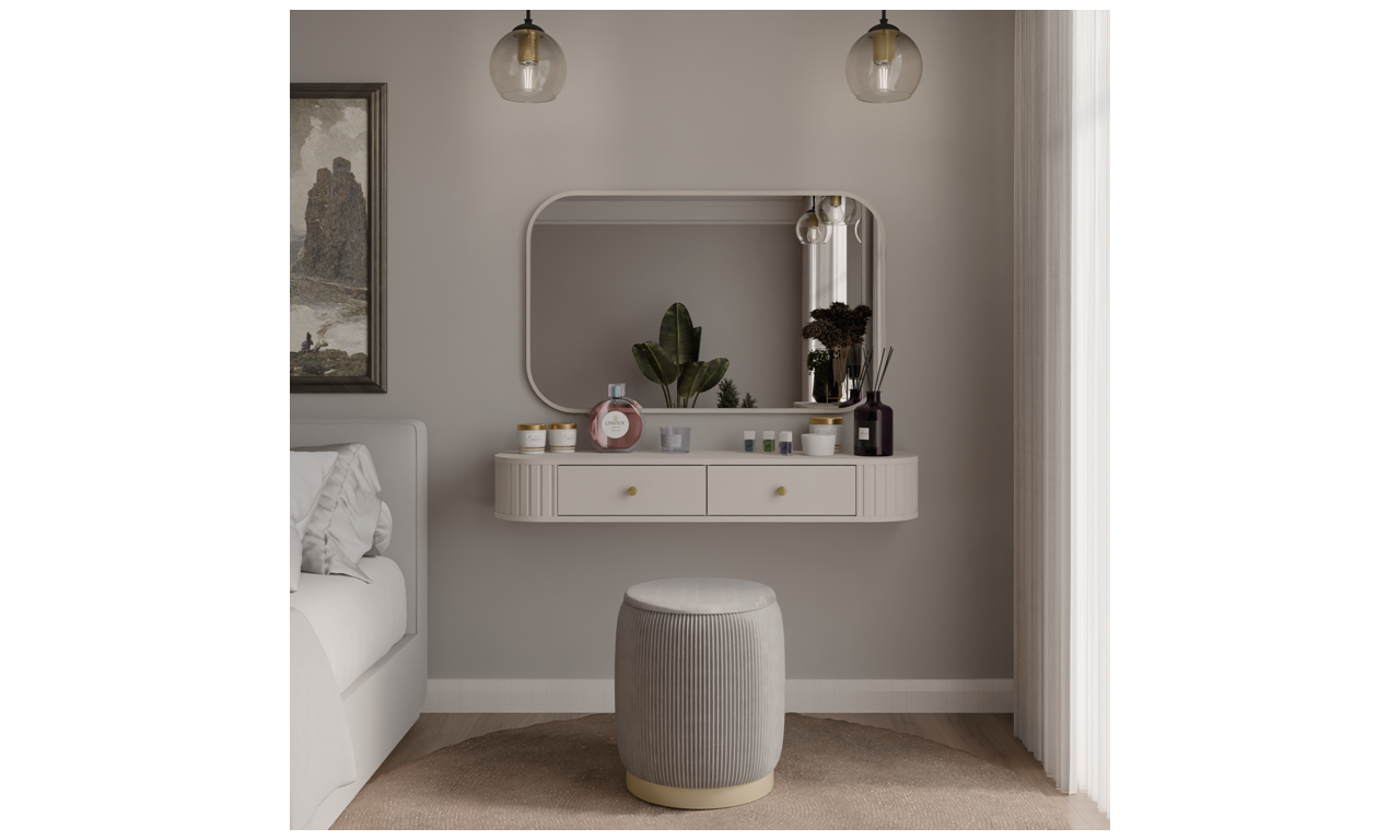 Meble do sypialni Ovalio w kolorystyce piaskowego beżu.
