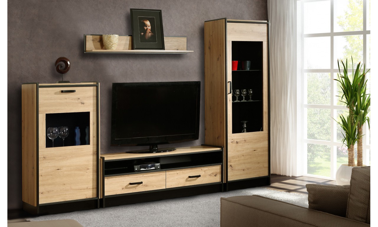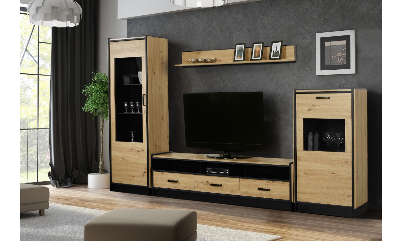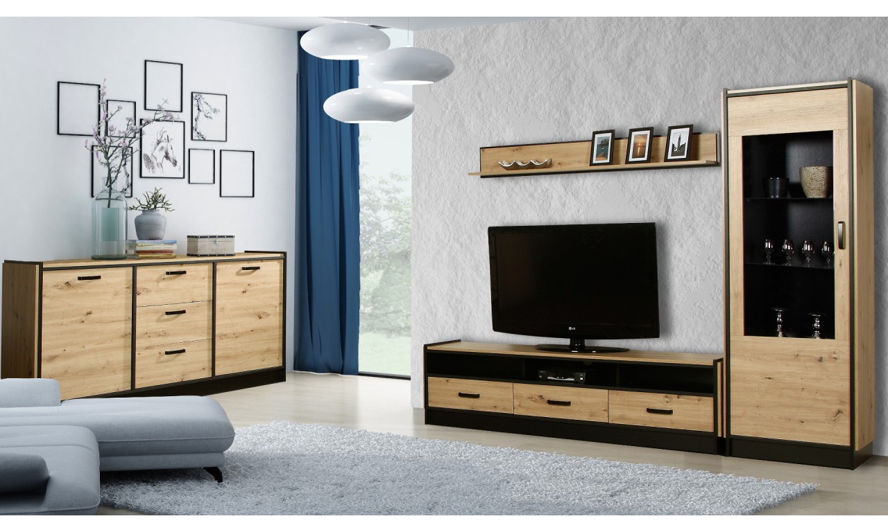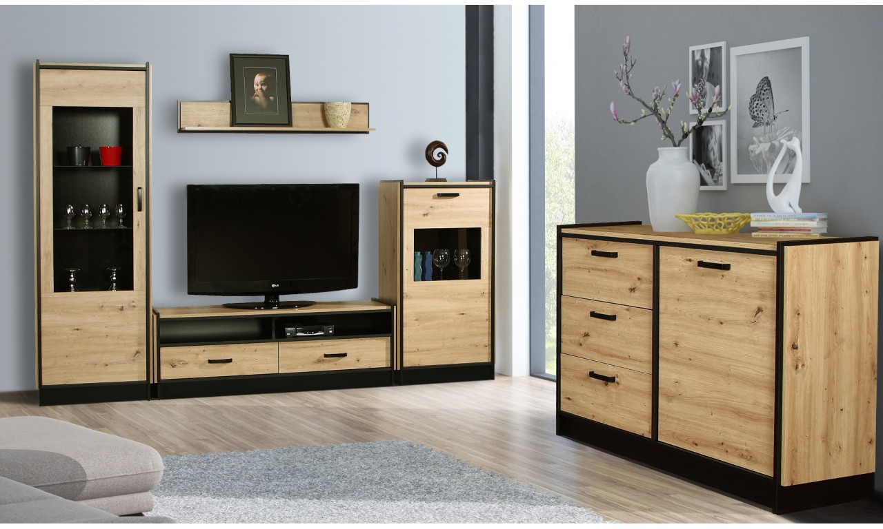 Zestaw mebli do salonu skomponowany z elementów kolekcji Karia, w skład którego wchodzą: witryna, stolik RTV, komoda i półka.