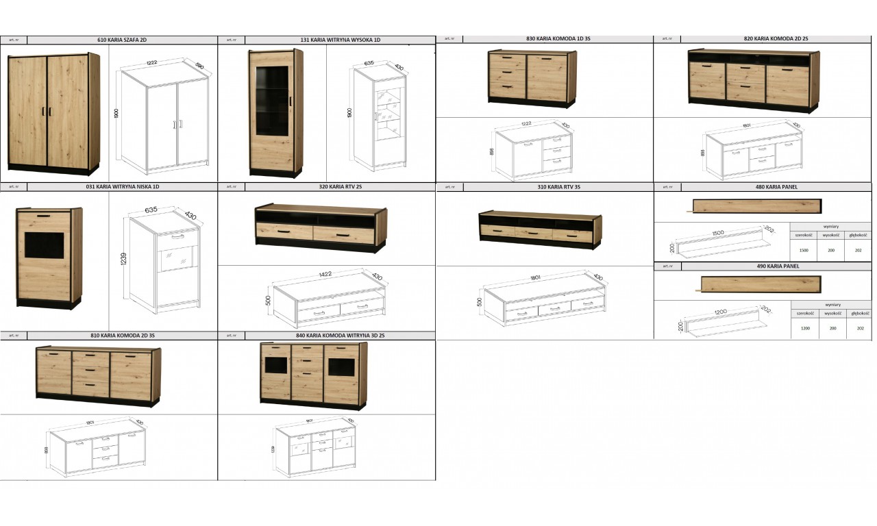 Półka należąca do kolekcji mebli do salonu Karia. Meble Karia wykonano z płyty laminowanej 16mm w połączonej kolorystyce czerni i dębu artisan. Obrzeża zabezpieczono trwałą i odporną okleiną typu ABS (fronty) i melaminą (korpusy). Meble Karia spoczywają na 5mm nóżkach z tworzywa sztucznego, szuflady zawieszono na prowadnicach kulkowych a całość dopełniają metalowe uchwyty. Szyby wykorzystane w drzwiczkach frontów witryn to 4mm szkło hartowane szlifowane, półki natomiast wykonano z 5mm szkła szlifowanego. Pozostałe elementy kolekcji Karia znajdą Państwo poniżej, w sekcji "powiązany produkt". Uwaga: meble do samodzielnego montażu.