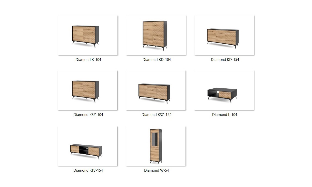 Kolekcja mebli do salonu Diamond zaprojektowana została jako połączenie stylu nowoczesnego i skandynawskiego. Meble Diamond wykonano z płyty laminowanej 16mm w połączeniu kolorystycznym czarny mat/dąb evoke. Uchwyty zastąpione systemem otwierania typu "push to open", a obrzeża mebli zabezpieczono trwałą i odporną okleiną typu ABS. Wyjątkowości dodają wysokie, 14cm metalowe nóżki oraz fronty z frezem w tzw. "jodełkę". Szkło zastosowane w meblach Diamond należy to grupy szkła hartowanego. Uwaga: meble do samodzielnego montażu.