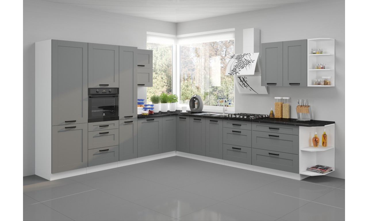 Szafka kuchenna należąca do zestawu mebli kuchennych LUNA. Fronty mebli kuchennych LUNA wyprodukowano z płyty MDF 16mm (pogrubionej do 19mm), a obrzeża zabezpieczono trwałą i odporną okleiną typu ABS o grubości 1mm, korpusy natomiast wykonano z płyty laminowanej 16mm zabezpieczonej na krawędziach melaniną. Całość dopełniają czarne, metalowe uchwyty. Zarówno w szufladach typu PREMIUM BOX jak i frontach zastosowano system cichego domyku.