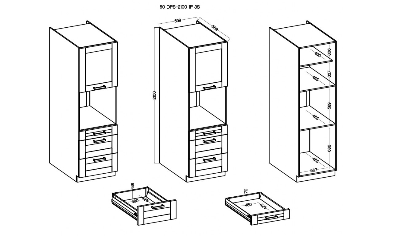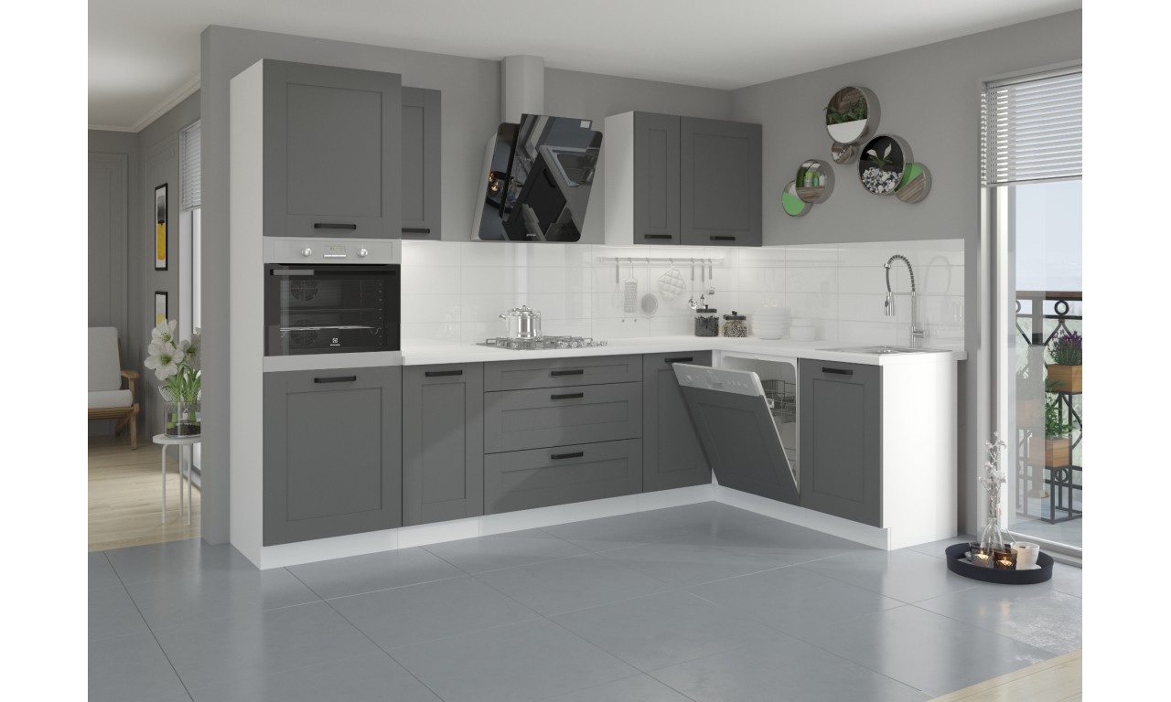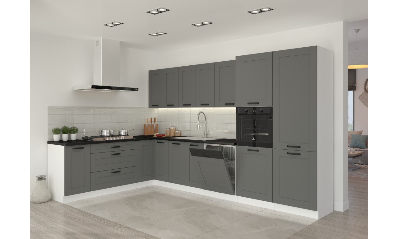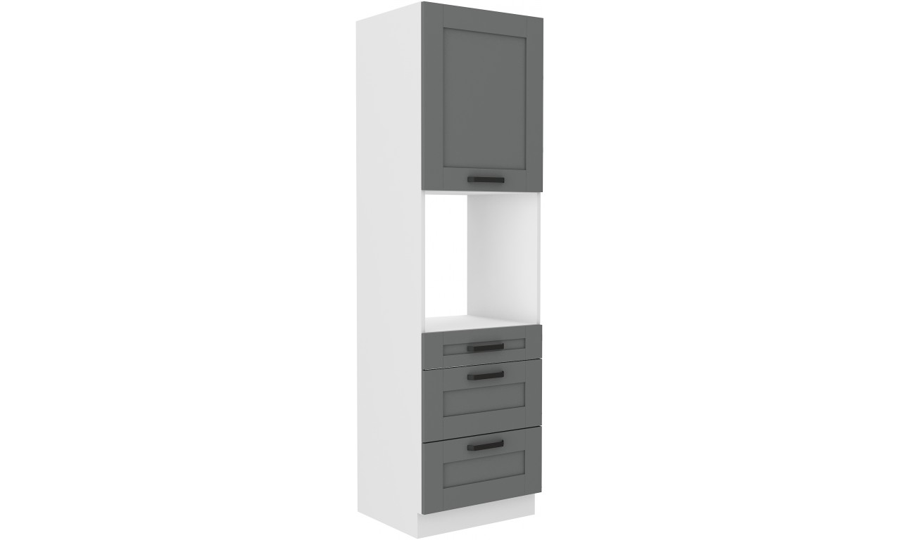 Szafka kuchenna należąca do zestawu mebli kuchennych LUNA dustgrey/white. Fronty mebli kuchennych LUNA, w kolorze matowej ciemne szarości, wyprodukowano z płyty MDF 16mm (pogrubionej do 19mm), a obrzeża zabezpieczono trwałą i odporną okleiną typu ABS o grubości 1mm, korpusy natomiast wykonano z płyty laminowanej 16mm zabezpieczonej na krawędziach melaniną. Całość dopełniają czarne, metalowe uchwyty. Zarówno w szufladach typu PREMIUM BOX jak i frontach zastosowano system cichego domyku.