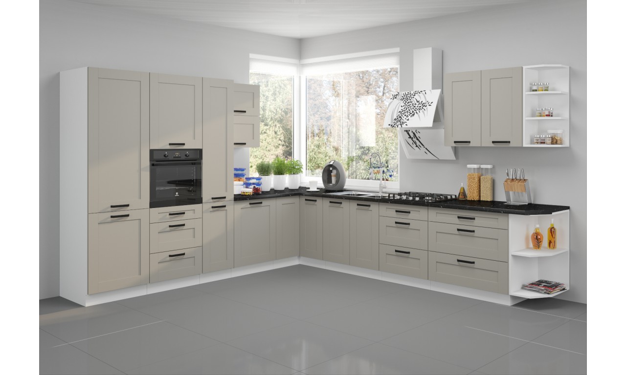 Szafka kuchenna należąca do zestawu mebli kuchennych LUNA claygrey/white. Fronty mebli kuchennych LUNA, w kolorze matowej jasnej szarości, wyprodukowano z płyty MDF 16mm (pogrubionej do 19mm), a obrzeża zabezpieczono trwałą i odporną okleiną typu ABS o grubości 1mm, korpusy natomiast wykonano z płyty laminowanej 16mm zabezpieczonej na krawędziach melaniną. Całość dopełniają czarne, metalowe uchwyty. Zarówno w szufladach typu PREMIUM BOX jak i frontach zastosowano system cichego domyku.