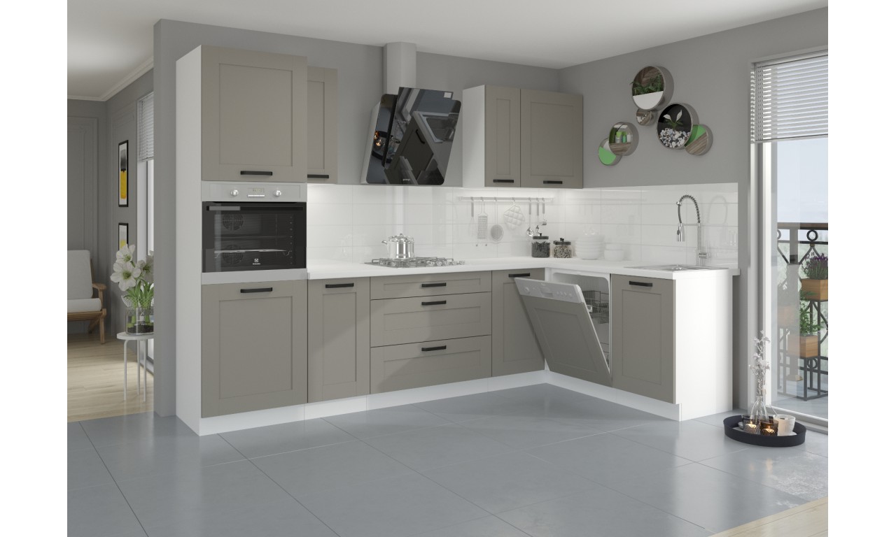 Szafka kuchenna należąca do zestawu mebli kuchennych LUNA claygrey/white. Fronty mebli kuchennych LUNA, w kolorze matowej jasnej szarości, wyprodukowano z płyty MDF 16mm (pogrubionej do 19mm), a obrzeża zabezpieczono trwałą i odporną okleiną typu ABS o grubości 1mm, korpusy natomiast wykonano z płyty laminowanej 16mm zabezpieczonej na krawędziach melaniną. Całość dopełniają czarne, metalowe uchwyty. Zarówno w szufladach typu PREMIUM BOX jak i frontach zastosowano system cichego domyku.