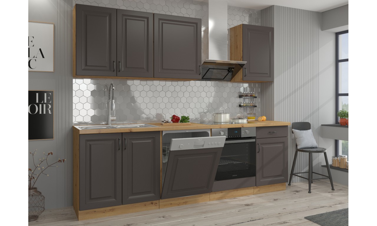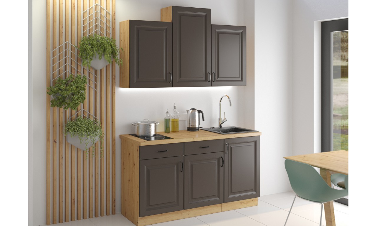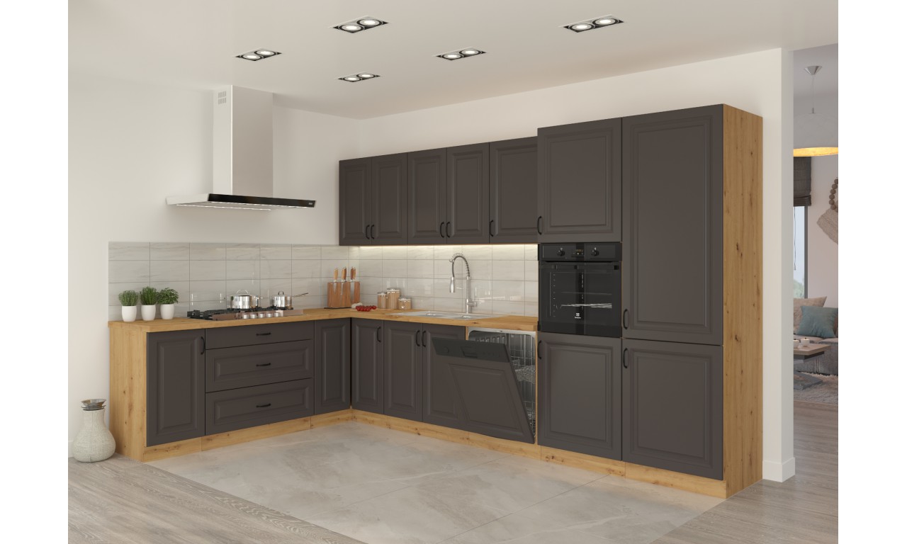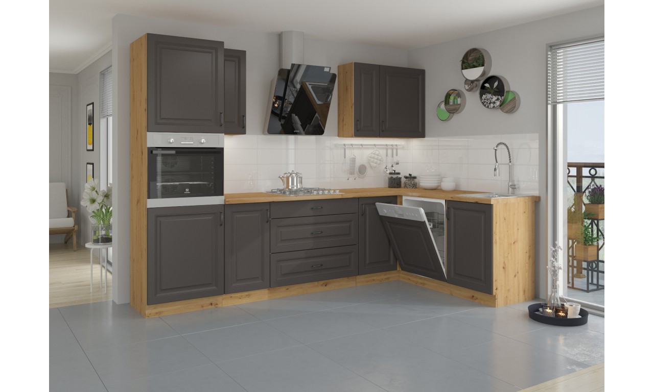 Szafka kuchenna należąca do zestawu mebli kuchennych STILO GR/AR. Meble Stilo wyróżniają się charakterystycznymi frezami na frontach w kolorze grafitu. Meble kuchenne STILO wyprodukowano z płyty laminowanej (korpusy) oraz MDFu (fronty) o grubości 16mm. Obrzeża korpusów zabezpieczono melaniną, a frontów - trwałą i odporną okleiną typu ABS. Zarówno w szufladach typu PREMIUM BOX jak i frontach zastosowano system cichego domyku. Całość dopełniają metalowe uchwyty.