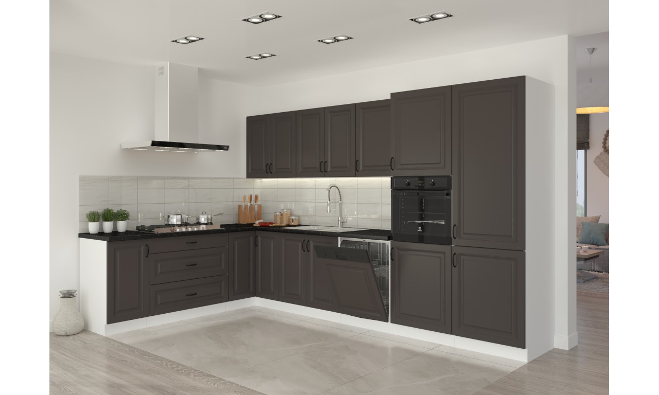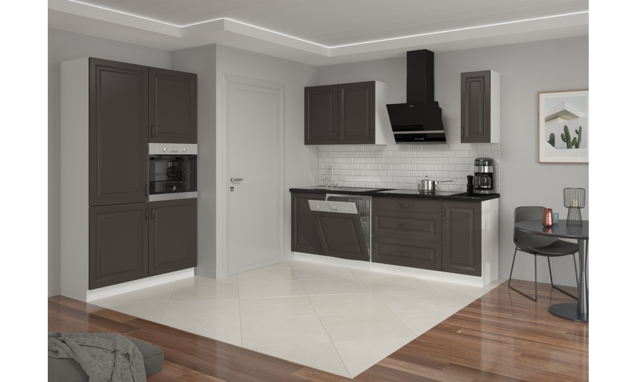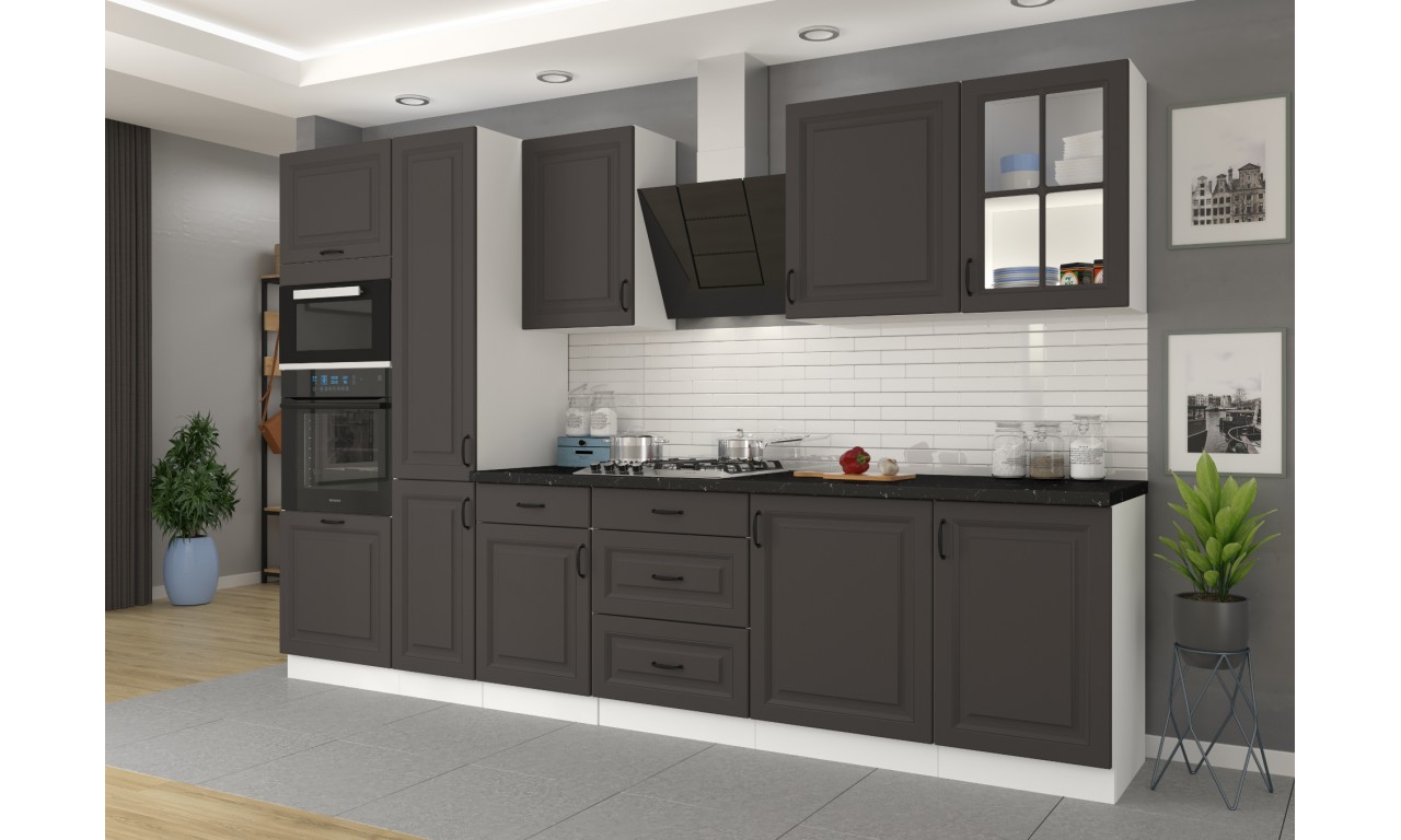 Szafka kuchenna należąca do zestawu mebli kuchennych STILO GR/WH. Meble Stilo wyróżniają się charakterystycznymi frezami na frontach w kolorze grafitowym. Meble kuchenne STILO wyprodukowano z płyty MDF o grubości 16mm. Obrzeża zabezpieczono trwałą i odporną okleiną typu ABS. Zarówno w szufladach typu PREMIUM BOX jak i frontach zastosowano system cichego domyku. Całość dopełniają metalowe uchwyty.