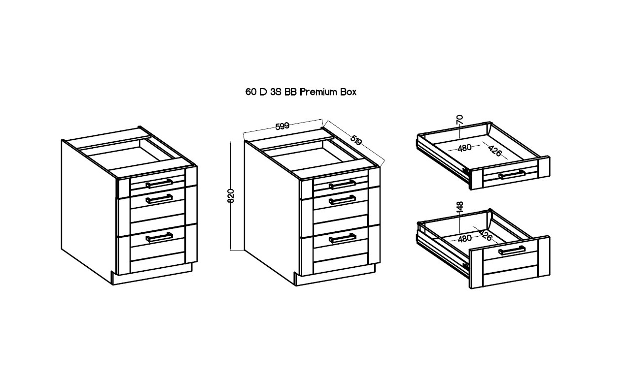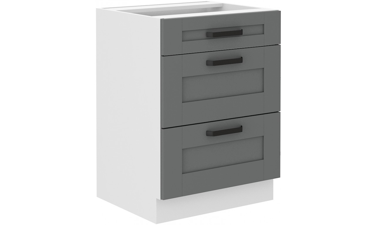 Szafka kuchenna należąca do zestawu mebli kuchennych LUNA dustgrey/white. Fronty mebli kuchennych LUNA, w kolorze matowej ciemne szarości, wyprodukowano z płyty MDF 16mm (pogrubionej do 19mm), a obrzeża zabezpieczono trwałą i odporną okleiną typu ABS o grubości 1mm, korpusy natomiast wykonano z płyty laminowanej 16mm zabezpieczonej na krawędziach melaniną. Całość dopełniają czarne, metalowe uchwyty. Zarówno w szufladach typu PREMIUM BOX jak i frontach zastosowano system cichego domyku.