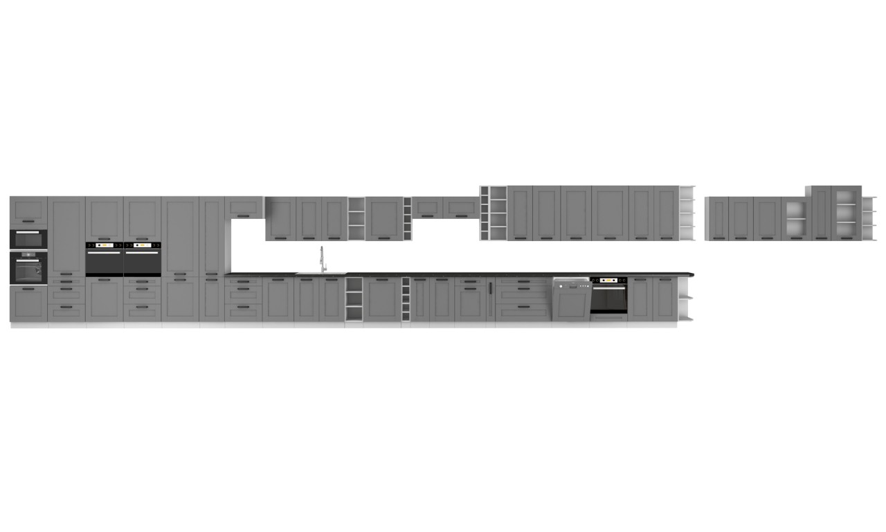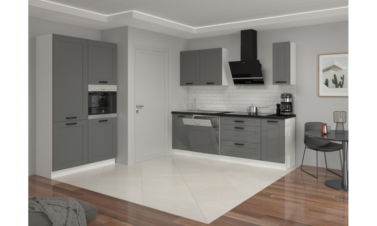 Szafka kuchenna należąca do zestawu mebli kuchennych LUNA dustgrey/white. Fronty mebli kuchennych LUNA, w kolorze matowej ciemne szarości, wyprodukowano z płyty MDF 16mm (pogrubionej do 19mm), a obrzeża zabezpieczono trwałą i odporną okleiną typu ABS o grubości 1mm, korpusy natomiast wykonano z płyty laminowanej 16mm zabezpieczonej na krawędziach melaniną. Całość dopełniają czarne, metalowe uchwyty. Zarówno w szufladach typu PREMIUM BOX jak i frontach zastosowano system cichego domyku.