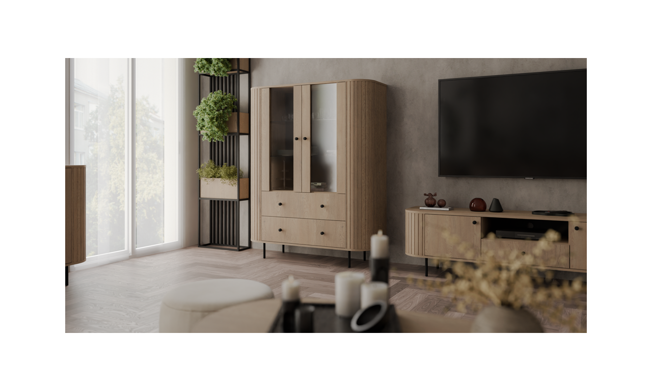 Wąska witryna będąca jednym z elementów zestawu mebli do salonu w stylu nowoczesnym IBIS