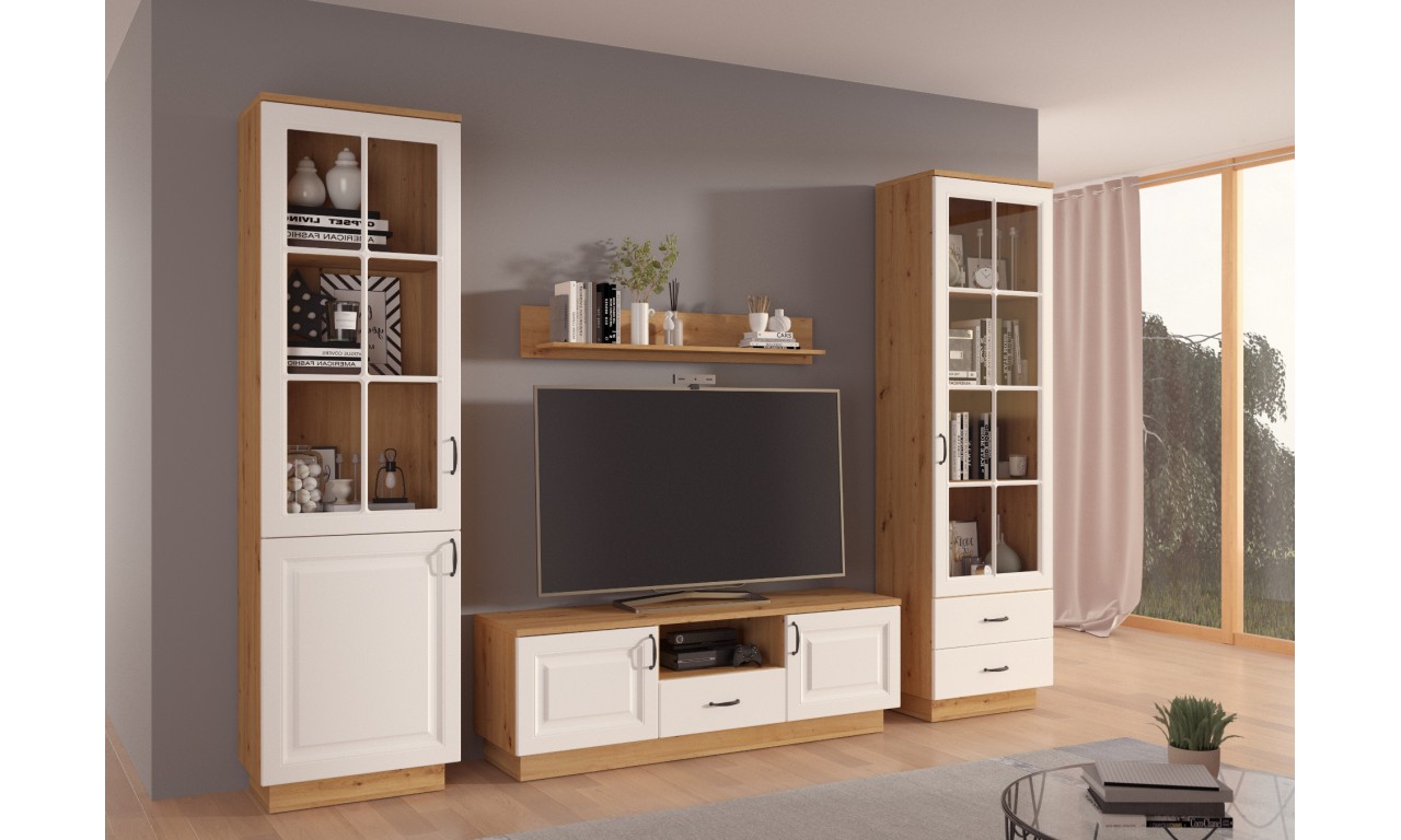 Zestaw mebli do salonu w stylu rustykalnym, w skład którego wchodzą dwie witryny, stolik RTV i półka.