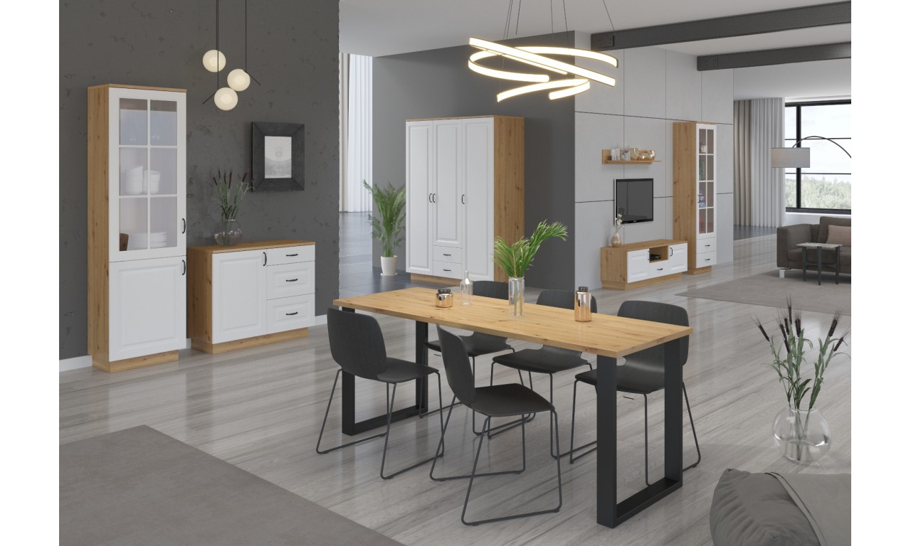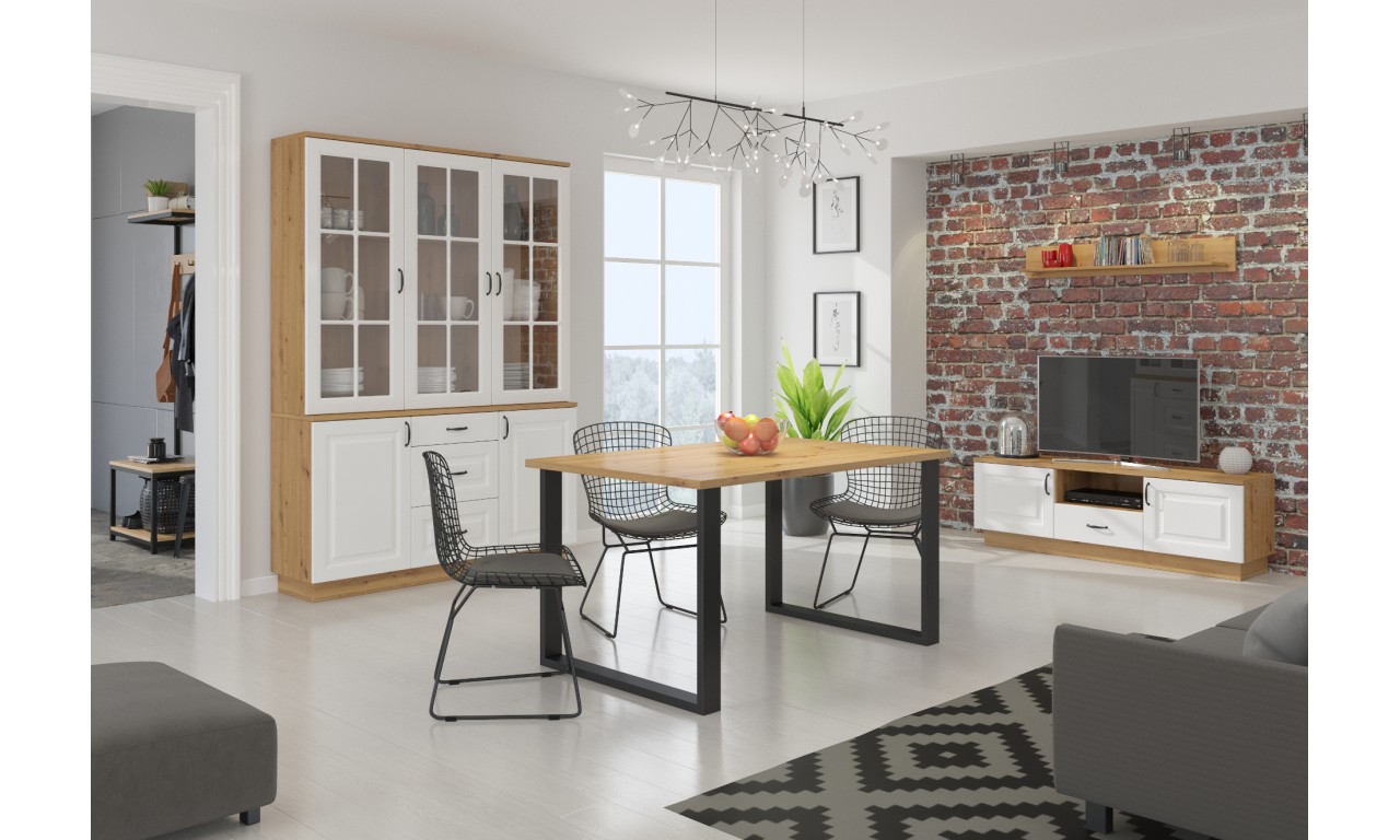 Witryna z szufladami należąca do zestawu mebli FLAWIA. Meble Flawia zaprojektowano w stylu rustykalnym z myślą o tworzeniu dowolnych zestawów zarówno do eleganckiego salonu jak i jadalni. Do produkcji mebli kolekcji FLAWIA wykorzystano frezowany, biały MDF, z którego wykonano fronty. Korpusy, w kolorze dąb artisan, wyprodukowano z płyty laminowanej 16mm, obrzeża zabezpieczono trwałą i odporną okleiną typu PCV a wszystko dopełniają metalowe uchwyty. Pozostałe meble z kolekcji FLAWIA znajdą Państwo poniżej, w zakładce "POWIĄZANY PRODUKT". Uwaga: meble do samodzielnego montażu.