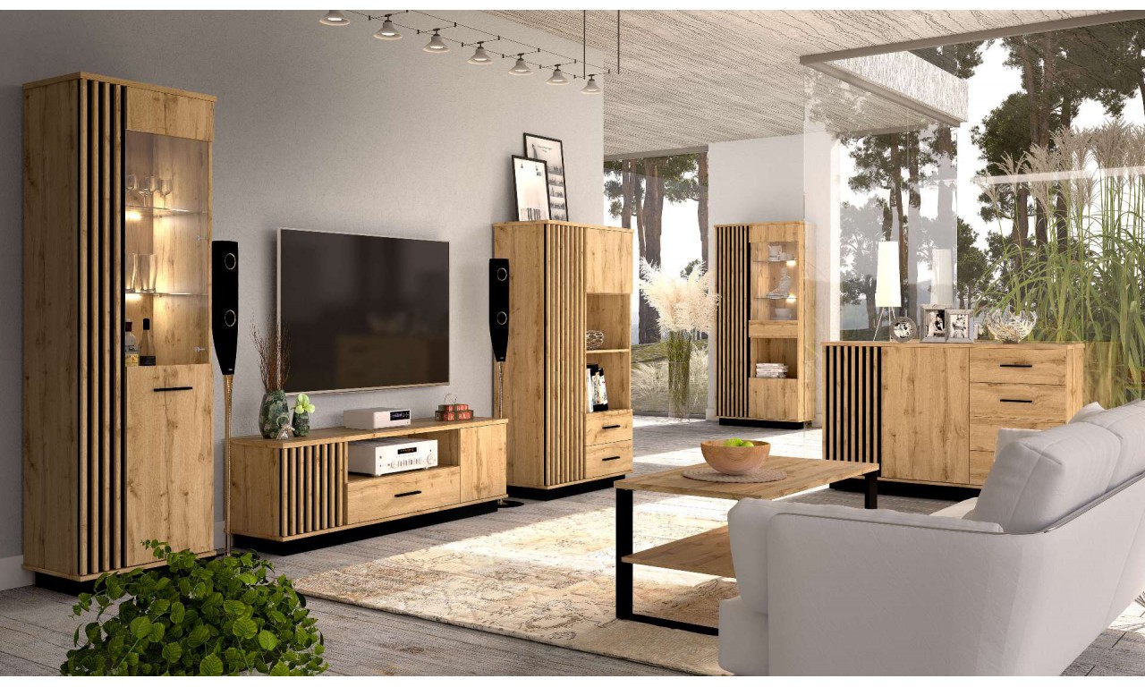 Zestaw mebli pokojowych zbudowany na bazie systemu MONSUN, w skład którego wchodzą witryna, ława, szafka wisząca, komoda i stolik RTV.