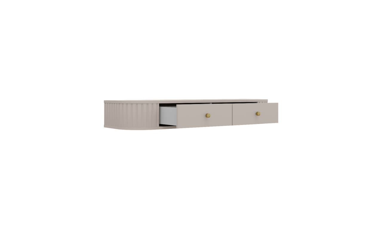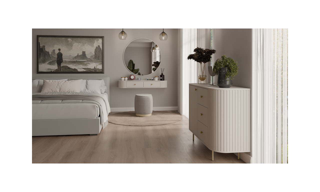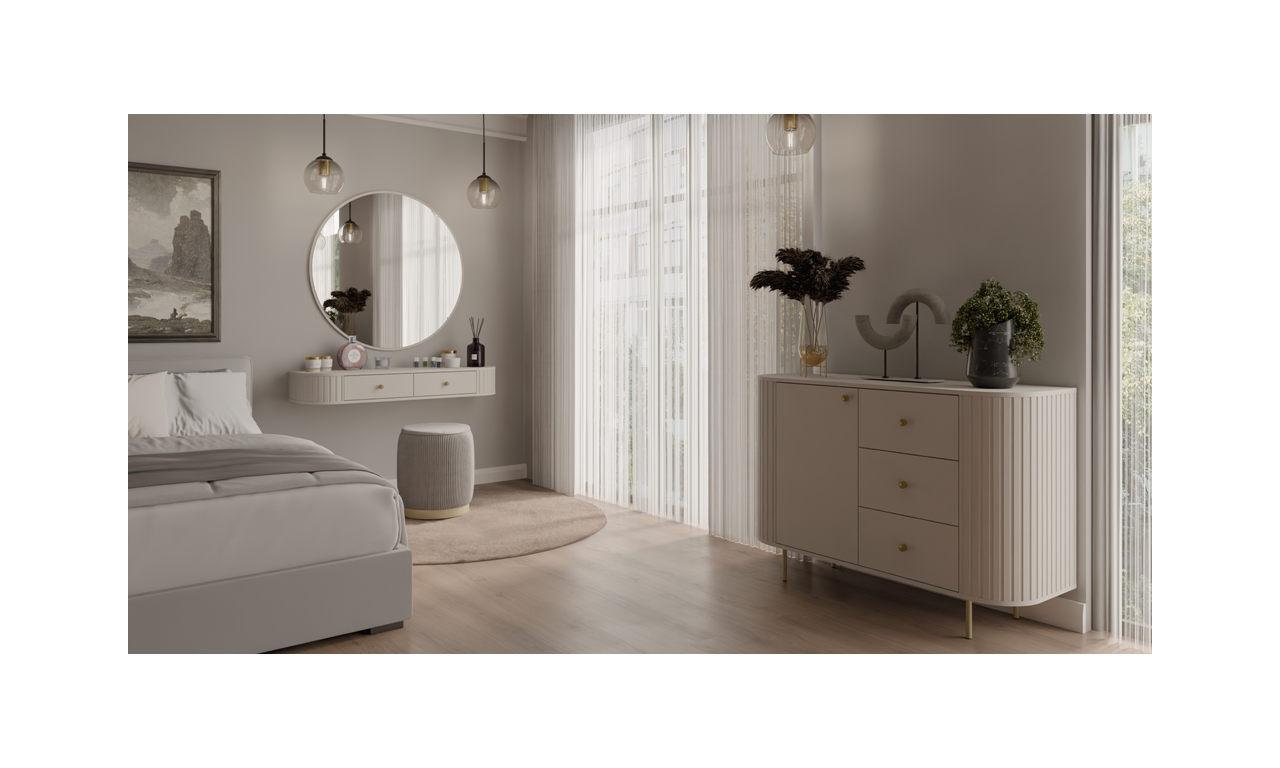 Meble do salonu i sypialni Ovalio w kolorystyce piaskowego beżu.